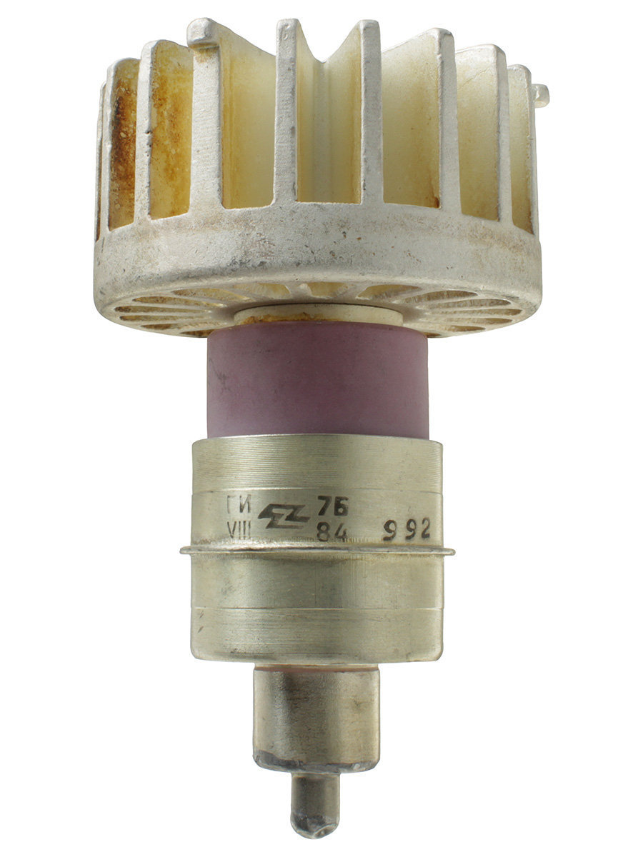 Импульсный генераторный триод ГИ-7Б в металлокерамическом исполнении с принудительным воздушным охлаждением для работы в сантиметровом и дециметровом диапазоне частот. Предназначен для генерирования и усиления колебаний в непрерывном режиме и импульсном режиме на частотах от 300 до 3000 МГц и мощностью до 11 кВт при анодной импульсной модуляции. Триод ГИ-7Б применяется для работы в генераторах с самовозбуждением и в усилителях радиотехнической аппаратуры общего и специального назначения. Выпускается в металлокерамическом оформлении с радиатором и цилиндрическими выводами катода, подогревателя и сетки. Охлаждение принудительное воздушное 24 м3/ч. Габаритные размеры триода ГИ-7Б: - высота лампы - не более 110,5 мм; - диаметр лампы - не более 65 мм. Масса не более 330 г.