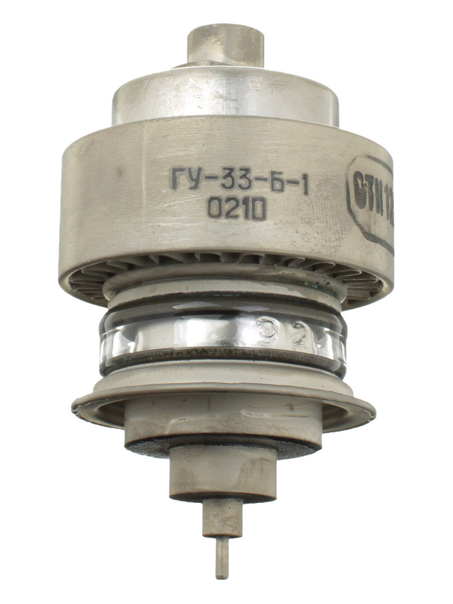 енераторный тетрод ГУ-33Б-1 в металлокерамическом исполнении с оксидным катодом косвенного накала и принудительным воздушным охлаждением. Предназначен для работы в качестве генератора или широкополосного усилителя высокочастотных колебаний на частотах до 500 МГц с выходной мощностью не менее 120 Вт. Тетрод ГУ-33Б-1 применяется в радиотехнических устройствах подвижной и стационарной аппаратуры общего и специального назначения. Катод оксидный косвенного накала. Выпускается в металлокерамическом исполнении с радиатором и цилиндрическими выводами катода, подогревателя и сеток. Работает в вертикальном положении, выводами вниз. Охлаждение принудительное воздушное не менее 40 м3/ч. Габаритные размеры тетрода ГУ-33Б-1: - высота лампы не более 85 мм; - диаметр лампы не более 50 мм. Масса не более 220 г.