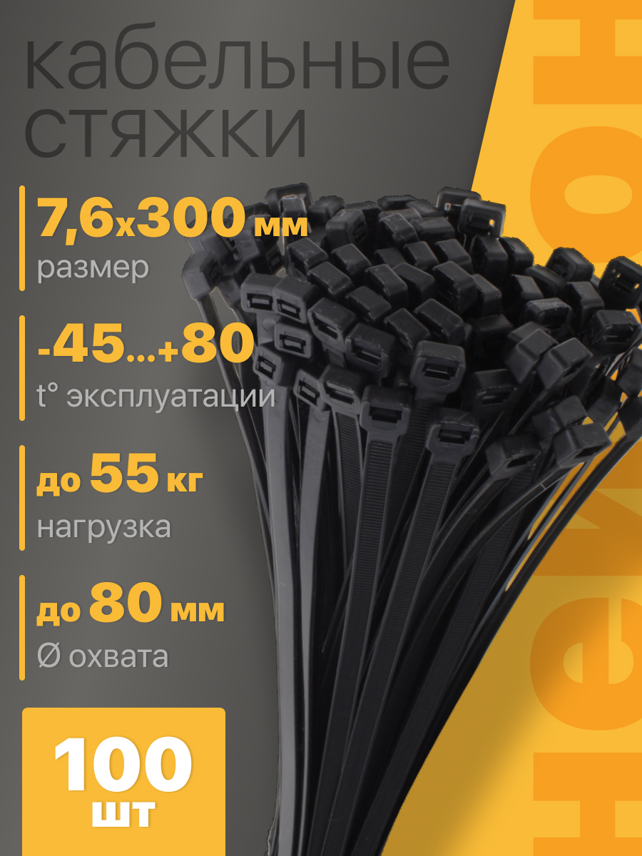 Стяжка кабеля 300*7.6мм Navigator, нейлоновая, черная, 100 штук