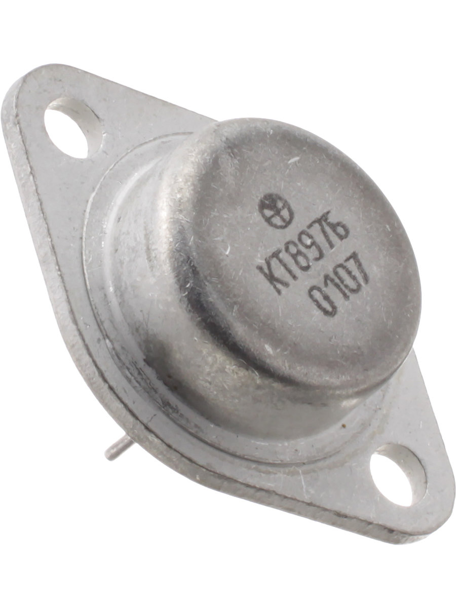 Транзисторы КТ897Б кремниевые планарные структуры n-p-n составные, высоковольтные, переключательные. Предназначены для применения в выходных каскадах электронного коммутатора в системах зажигания автомобилей, вторичных источниках питания и других импульсных схемах с индуктивной нагрузкой. Выпускаются в металлическом корпусе со стеклянными изоляторами и жёсткими выводами. Маркировка нанесена цифро-буквенным кодом на корпусе транзистора. Тип корпуса: КТ-9 (TO-3).