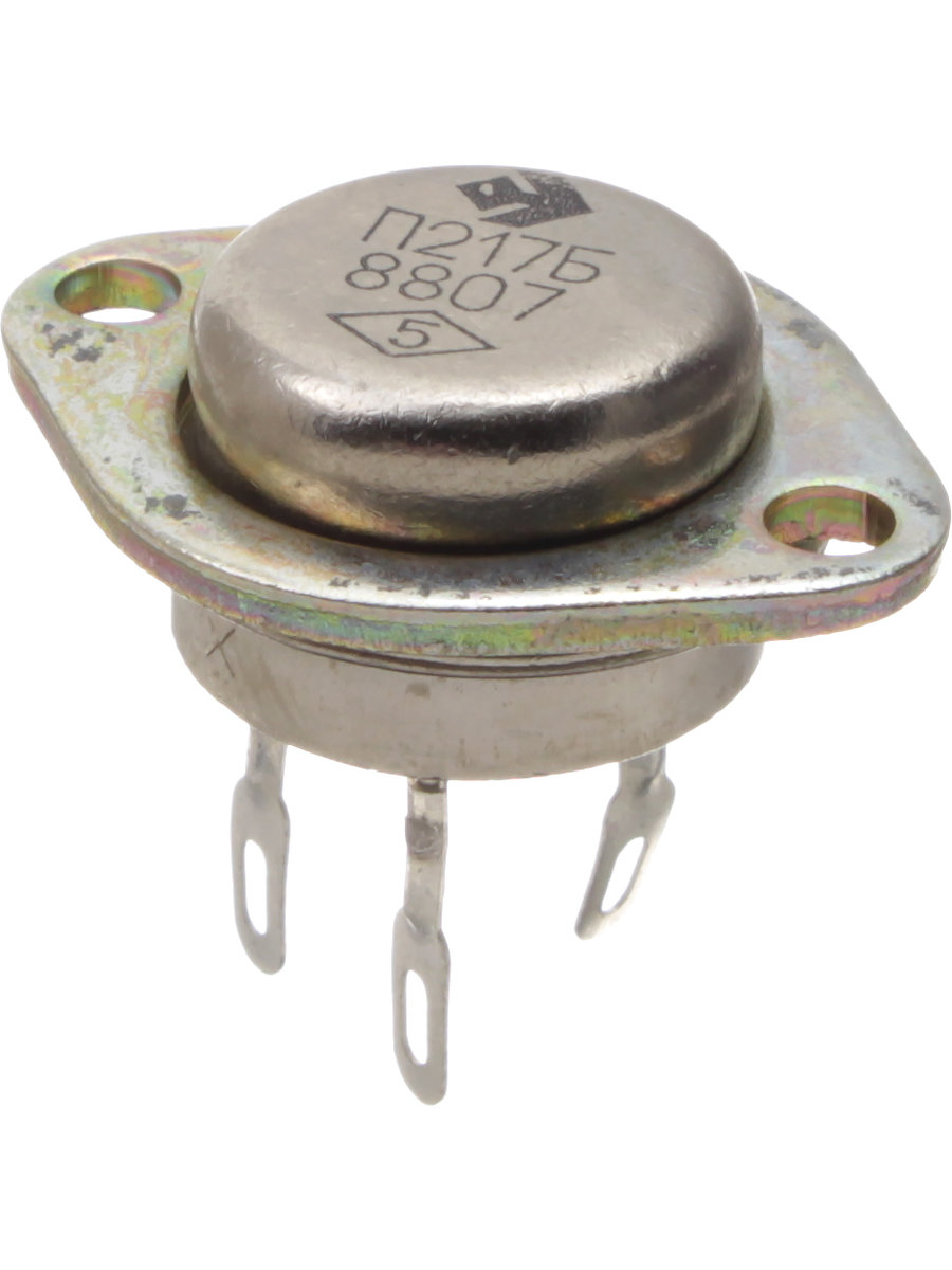 Транзисторы П217Б германиевые сплавные структуры p-n-p универсальные. Предназначены для применения в переключающих устройствах, выходных каскадах усилителей низкой частоты, преобразователях постоянного напряжения. Используются для работы в радиотехнических и электронных устройствах общего и специального назначения. Выпускаются в металлическом корпусе со стеклянными изоляторами и жесткими выводами. Маркируются цифро-буквенным кодом на корпусе транзистора. Масса транзистора не более 12,5 г, крепежного фланца не более 4,5 г.