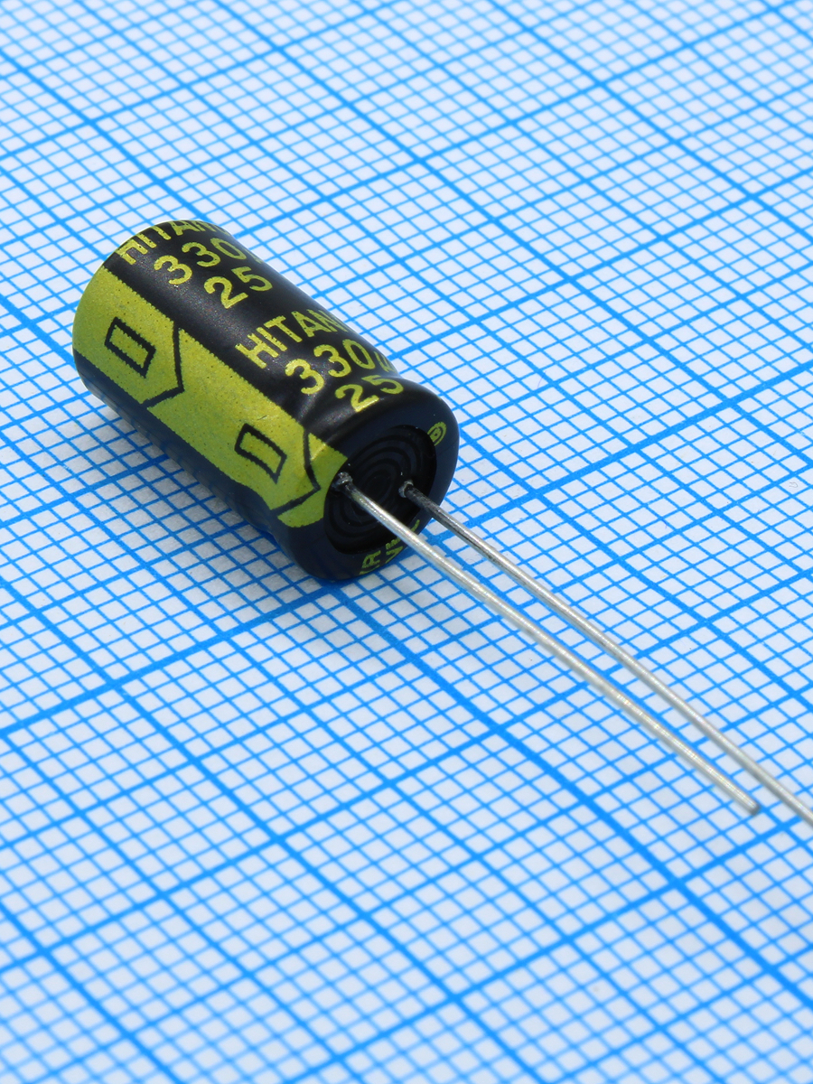 Тип: Конденсатор алюминиевый электролитический 330мкФ 25В ±20% (8 X 14мм) радиальный 3.5мм 0.12Ом 700мА 3000час 105С россыпь