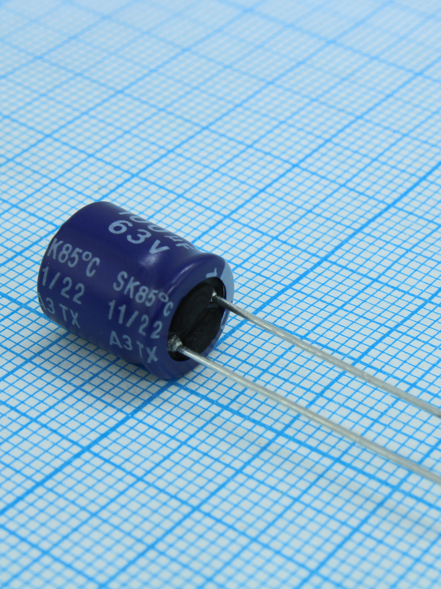 Тип конденсатора: Конденсатор алюминиевый электролитический 100мкФ 63В ±20% (10х12.5мм) радиальный 5мм 330мА 2000часов 85C россыпь